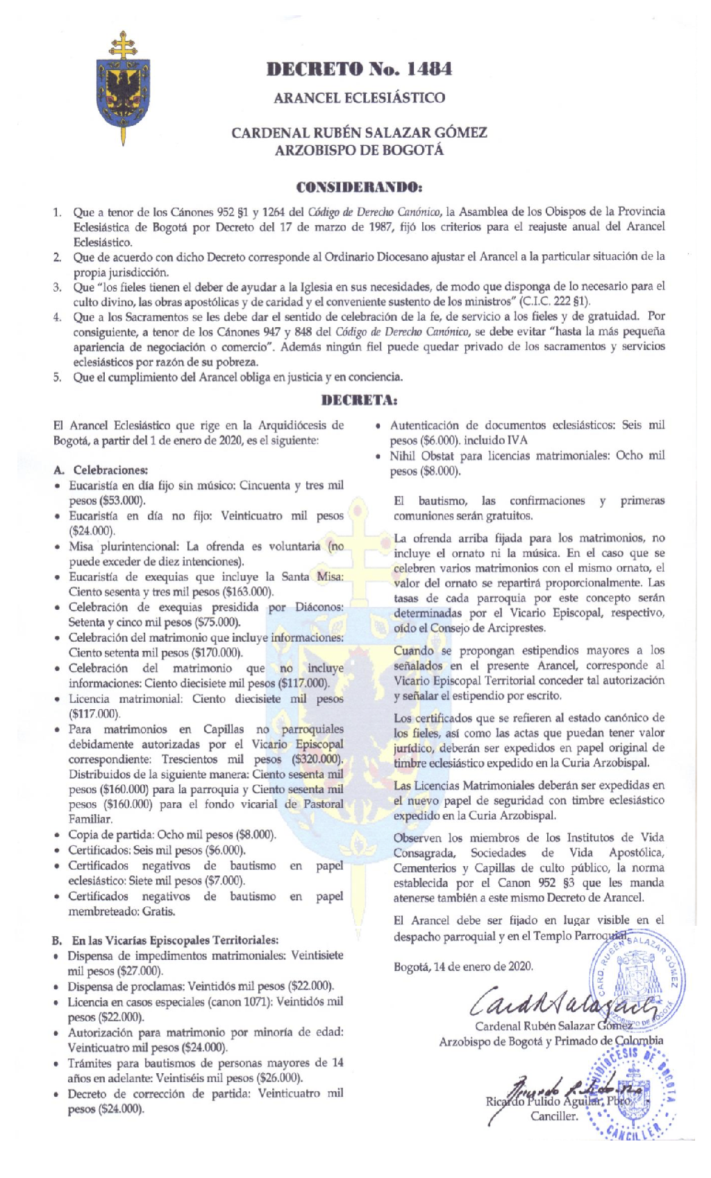 El señor canciller,padre Ricardo Pulido, ha dispuesto la publicación del decreto de Arancel