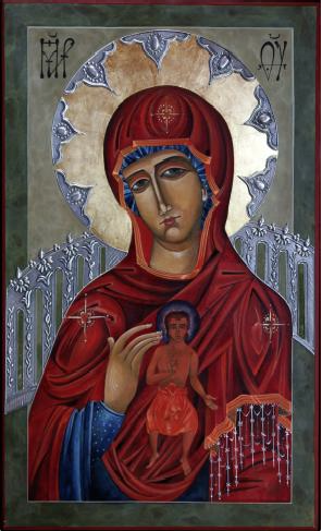 9 – “Las madres/diosas de las culturas antiguas fueron alguna vez poderosas”, comenta Mary Jane Miller. “La autoridad de la Iglesia tomó el aspecto femenino en su plenitud y relegó a la Virgen María de eso a un pasivo “otredad”, excluída de la tríada divina”. En “Tres Manos” la Madre de Dios se presenta bajo una nueva luz sorprendente. Ver más de la obra del artista en http://www.sanmiguelicons.com