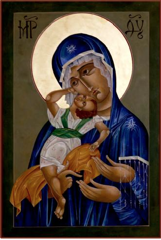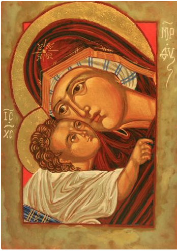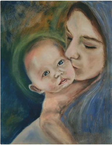 11 – “Madre de Dios y el Dulce Beso”, pintado en una iconografía tradicional, “refleja la cercanía íntima del niño Jesús y su Madre”, dice Susan Ogilvie. Como mujer, católica y artista, Ogilvie considera que “pintar imágenes de la Virgen y el Niño acercan una lengua sagrada y una expresión que llenan lugares muy profundos de mi alma”.