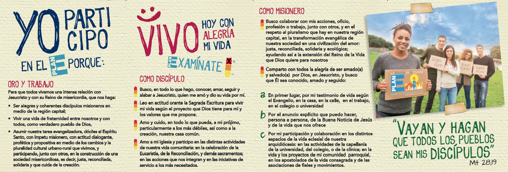 - Promover el Plan de Evangelización - “Plan E”, de la arquidiócesis de Bogotá con testimonios que comuniquen ser sal de la tierra y luz del mundo en Jesucristo, para que todos en Él tengamos vida.