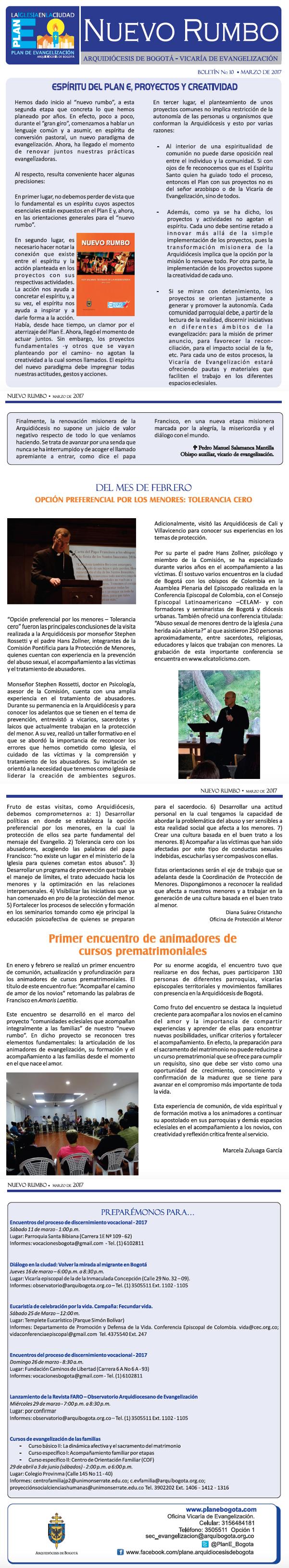Por eso, para alcanzar estas metas propuestas se han diseñado espacios de oración, reflexión, formación y participación en torno al Plan de Evangelización con el propósito de conocer, comprender y acoger este proyecto de vida arquidiocesano y de iniciar un proceso de revisión crítica de nuestra práctica evangelizadora. Estos espacios están dirigidos a toda la comunidad arquidiocesana, especialmente a los animadores de evangelización. En este boletín encontrarán la información detallada de estas actividades.