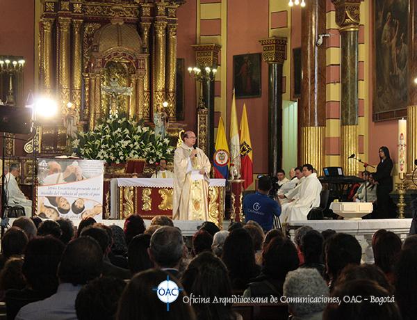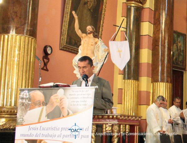 La Eucaristía fue presidida por monseñor Jaime Mancera, vicario de Evangelización de la arquidiócesis de Bogotá, concelebraron los monseñores: Jorge Alberto Ayala, Sergio Pulido y Daniel Delgado, algunos sacerdotes como Pedro Prado, Victor Moreno y Mauricio Urbina, entre otros de la Vicaría Episcopal Territorial de la Inmaculada, con la participación de algunos diáconos, como Alirio Cáseres y el equipo Pastoral Nacional de los trabajadores, fieles y agentes de pastoral.