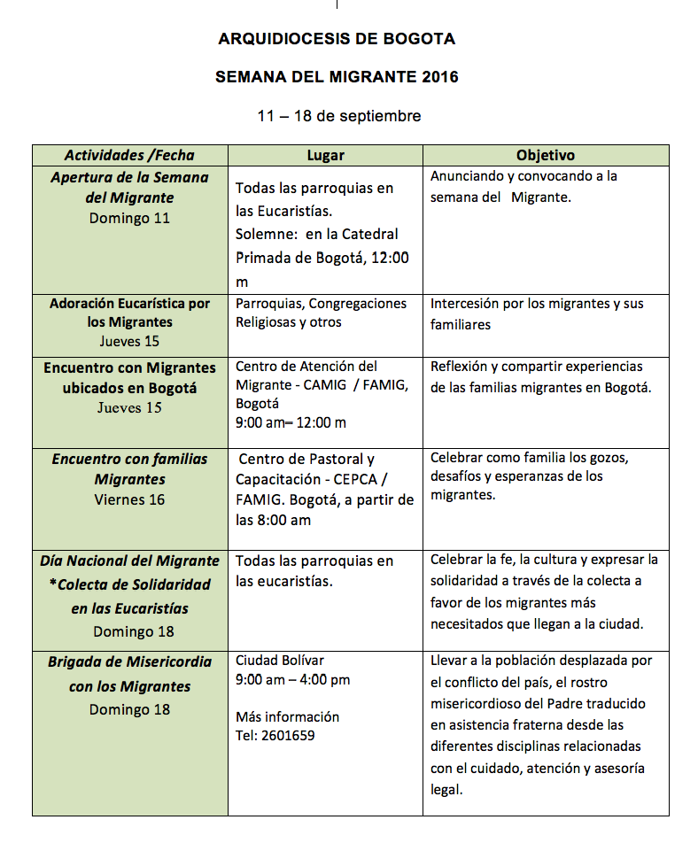 A continuacón podrán ver el programa a desarrollar en esta semana del Migrante en la ciudad de Bogotá:
