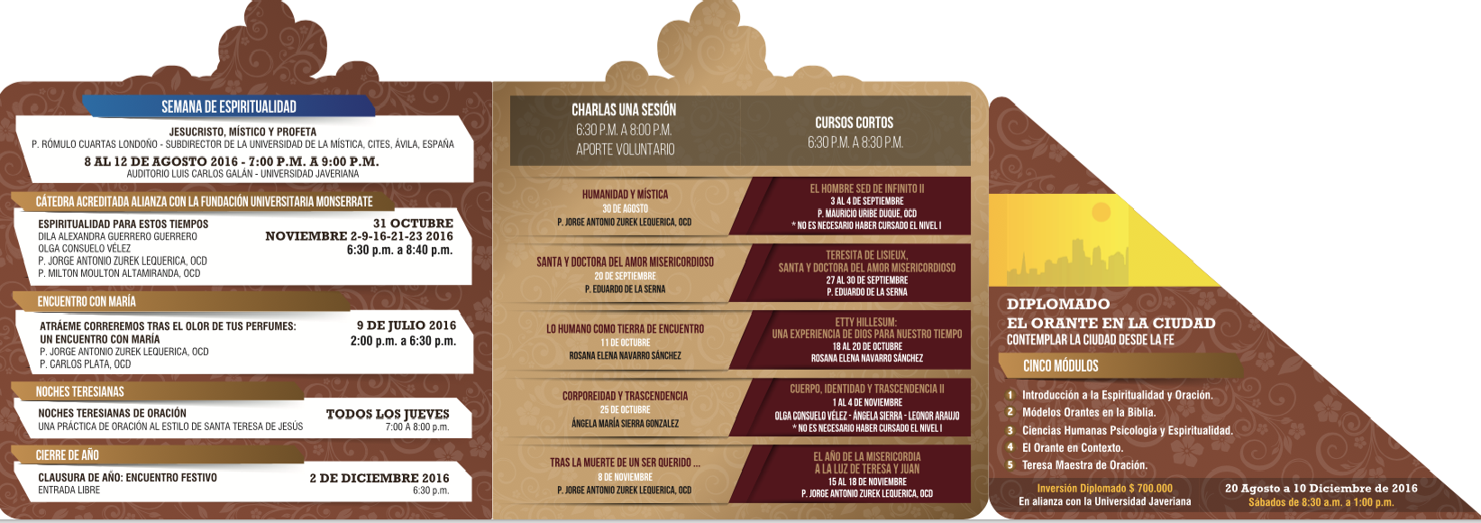 Tenemos el gusto de presentarles nuestra programación del II Semestre de 2016, haciendo énfasis en la Semana de Espiritualidad “Jesucristo, Místico y Profeta” y el diplomado “El orante en la ciudad”, en convenio con la Pontificia Universidad Javeriana. Además de una amplia oferta académica y experiencial de talleres de oración, ciclo de conferencias, cursos cortos y el cierre de año con un encuentro festivo.