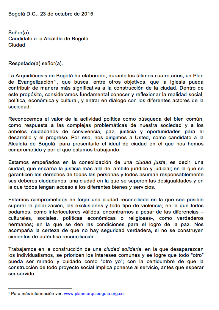 Próximamente, daremos a conocer las conclusiones de este conversatorio, donde lo prioritario desde la arquidiócesis de Bogotá, es que los candidatos a la alcaldía conozcan a través de la siguiente carta que se les entregará hoy viernes 23 de octubre, el Plan de Evangelización que también está construyendo la ciudad que se espera: “La Iglesia Católica que peregrina en Bogotá asume su misión de ser “sal y luz” y se pone en actitud de colaboración con todo lo que conduzca a la transformación de la ciudad, en ciudad de misericordia en la que florezca la justicia, la reconciliación y la solidaridad, en la que nazca una nueva conciencia y unas nuevas actitudes frente al cuidado de la creación”.