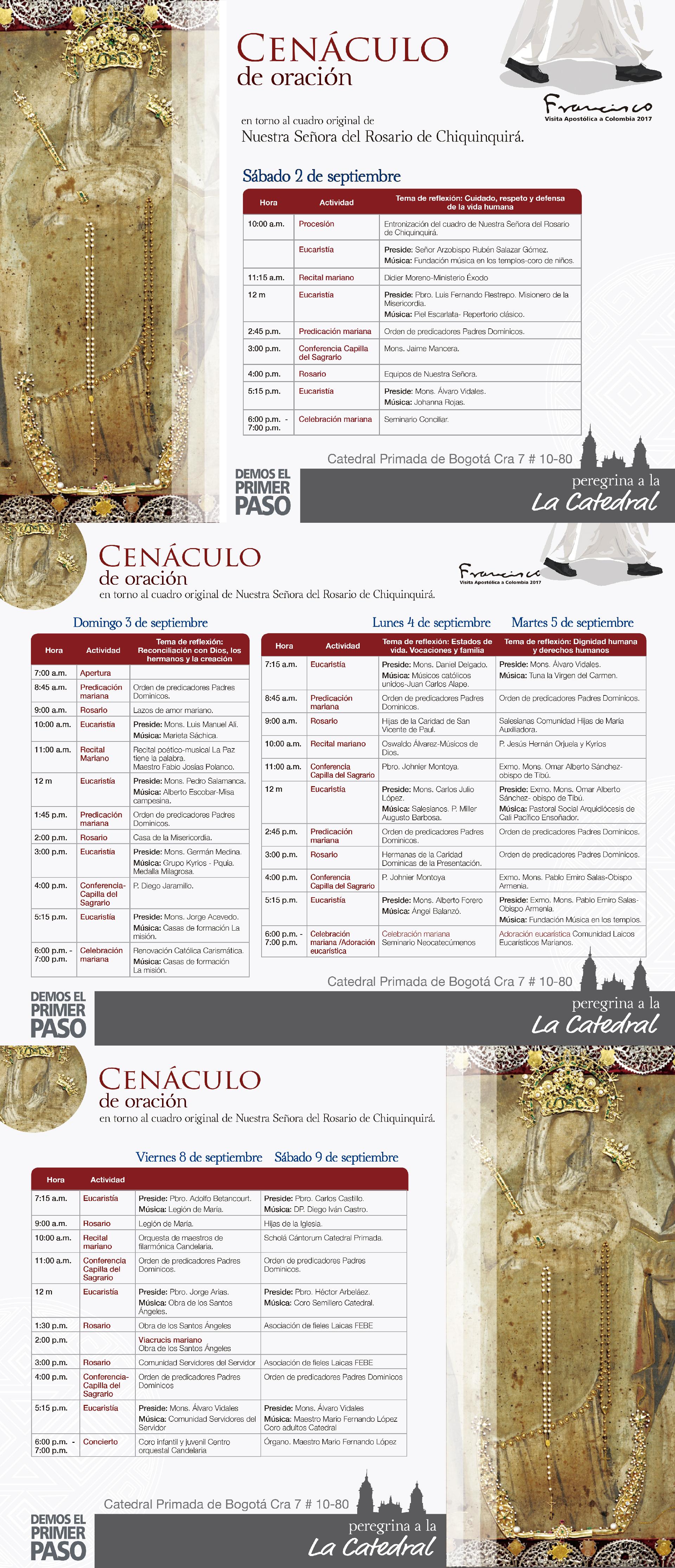 A continuación programación completa sobre cenáculo de oración entorno al cuadro original de Nuestra Señora del Rosario de Chinquinquirá: