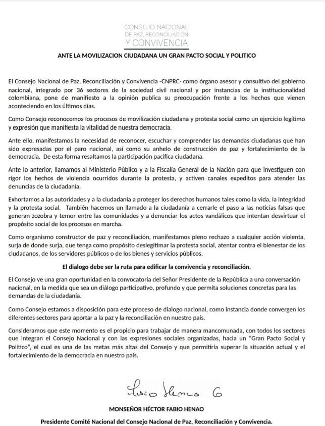 Comunicado del Consejo Nacional de Paz ante movilizaciones ciudadanas