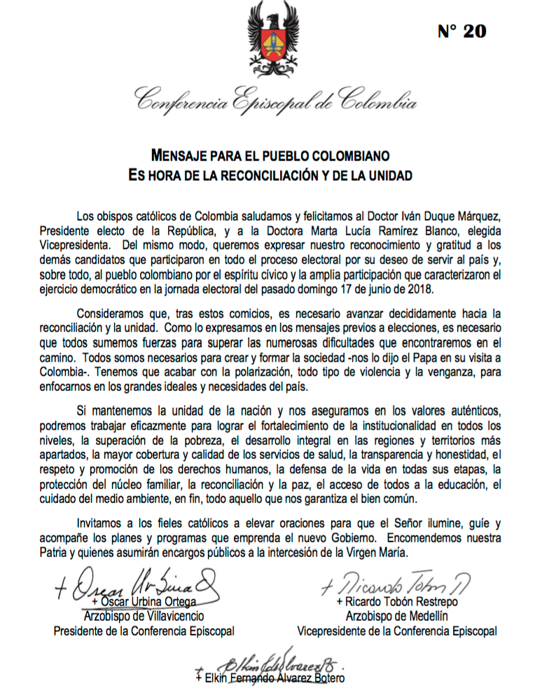 Iglesia de Colombia saluda al nuevo Presidente de la República