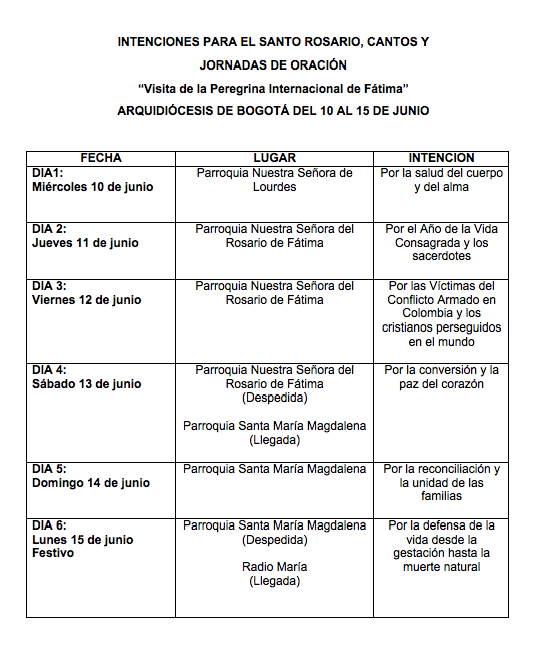 Podrá ser venerada en Bogotá, durante los días 10 al 15 de junio, para cada día se tendrá una intención de oración (ver cuadro):
