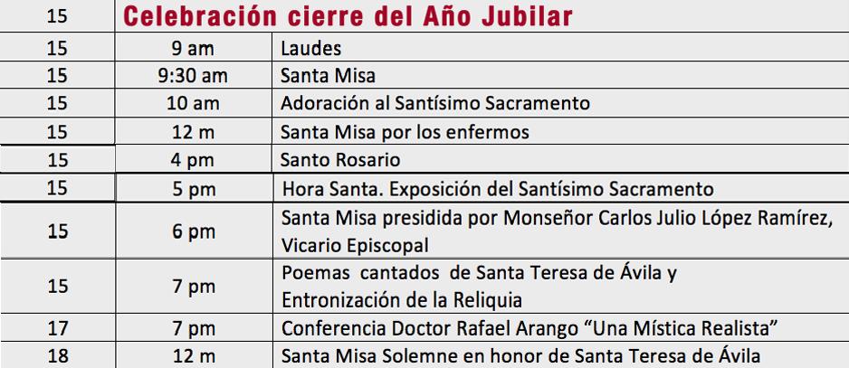 En el templo parroquial de Santa Teresa de Ávila, durante este mes de octubre se ha expuesto una reliquia de primer grado de Santa Teresa de Ávila, la cual tendrá su entronización durante la solemnidad del cierre del Año Jubilar en la Santa Misa de 6:00 p.m., que será presidida por monseñor Carlos Julio López Ramírez, vicario episcopal de la vicaría de Cristo Sacerdote de la arquidiócesis de Bogotá.