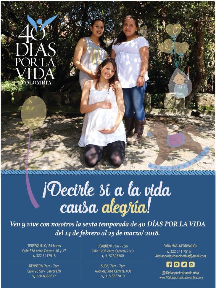 El 23 de septiembre de 2015, Colombia se sumó primera vez a la campaña internacional 40 días por la vida ( www.40daysforlife.com), que tiene como principal objetivo convocar a la comunidad en un mismo espíritu de unidad, para hacer una vigilia de oración y ayuno durante 40 días y noches seguidas frente a un centro abortista.