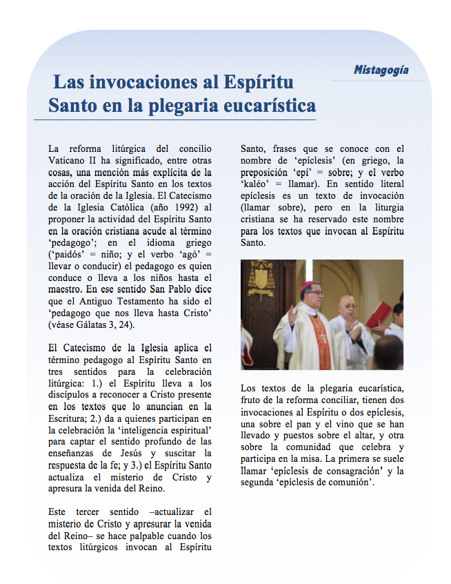En los textos del evangelio de la misa de estas últimas semanas de Pascua Jesús viene animando la esperanza de los discípulos sobre la certeza de continuar unido a ellos cuando Él regrese al Padre, para ello el mismo Maestro viene afirmando también que el Espíritu que el Padre envía es el garante y el autor de esta comunión. En el texto de la primera lectura de este domingo (Hechos 1, 1-11) el autor ofrece dos informaciones acerca la convivencia del Resucitado con los discípulos: les dio pruebas de que está vivo y les habló del Reino de Dios; en este contexto les recuerda la promesa del envío del Espíritu Santo.