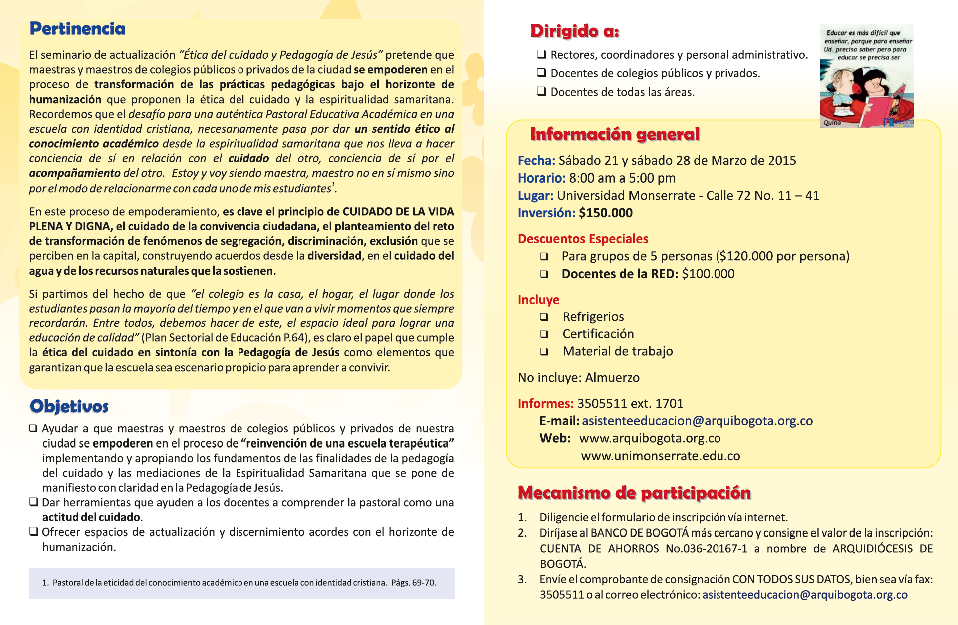 Para este proceso de actualización contamos con la iluminación del Dr. Bernardo Toro profesional de larga experiencia en su compromiso con una sociedad más ética y justa desde los distintos ámbitos sociales e institucionales en que él aporta luces fuertemente significativas. La Dra. Li Mizar Salamanca quien desde su formación teológica y de lectura de realidad nos fundamenta su propuesta desde el Evangelio de Jesús para la ética del cuidado. Todo ello en consonancia con el nuevo paradigma de evangelización del Plan E de nuestra Arquidiócesis de Bogotá.