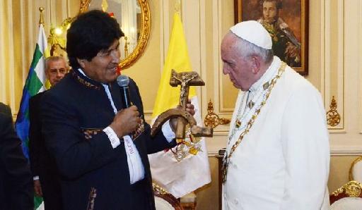 Además, le entregó el tallado de una cruz formada con la hoz y el martillo, que es una reproducción de una que hizo el sacerdote jesuita español Espinal, asesinado en 1980 por paramilitares por su compromiso con las luchas sociales en Bolivia, y a quien Francisco dedicó hoy un homenaje cerca del lugar donde hallaron su cadáver.
