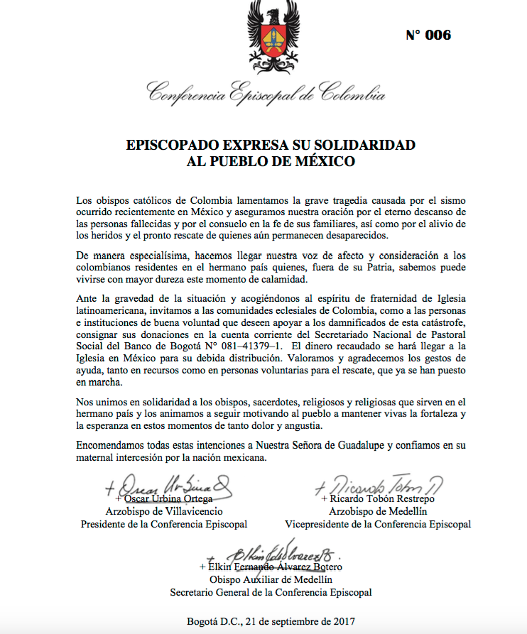 Así mismo, invitaron a las comunidades eclesiales, personas e instituciones de buena voluntad para que puedan apoyar a los damnificados. Para tal fin se puede consignar las donaciones en la cuenta corriente del Secretariado Nacional de Pastoral Social del Banco de Bogotá No. 081–41379–1. El dinero recaudado se hará llegar a la Iglesia en México para su debida distribución.