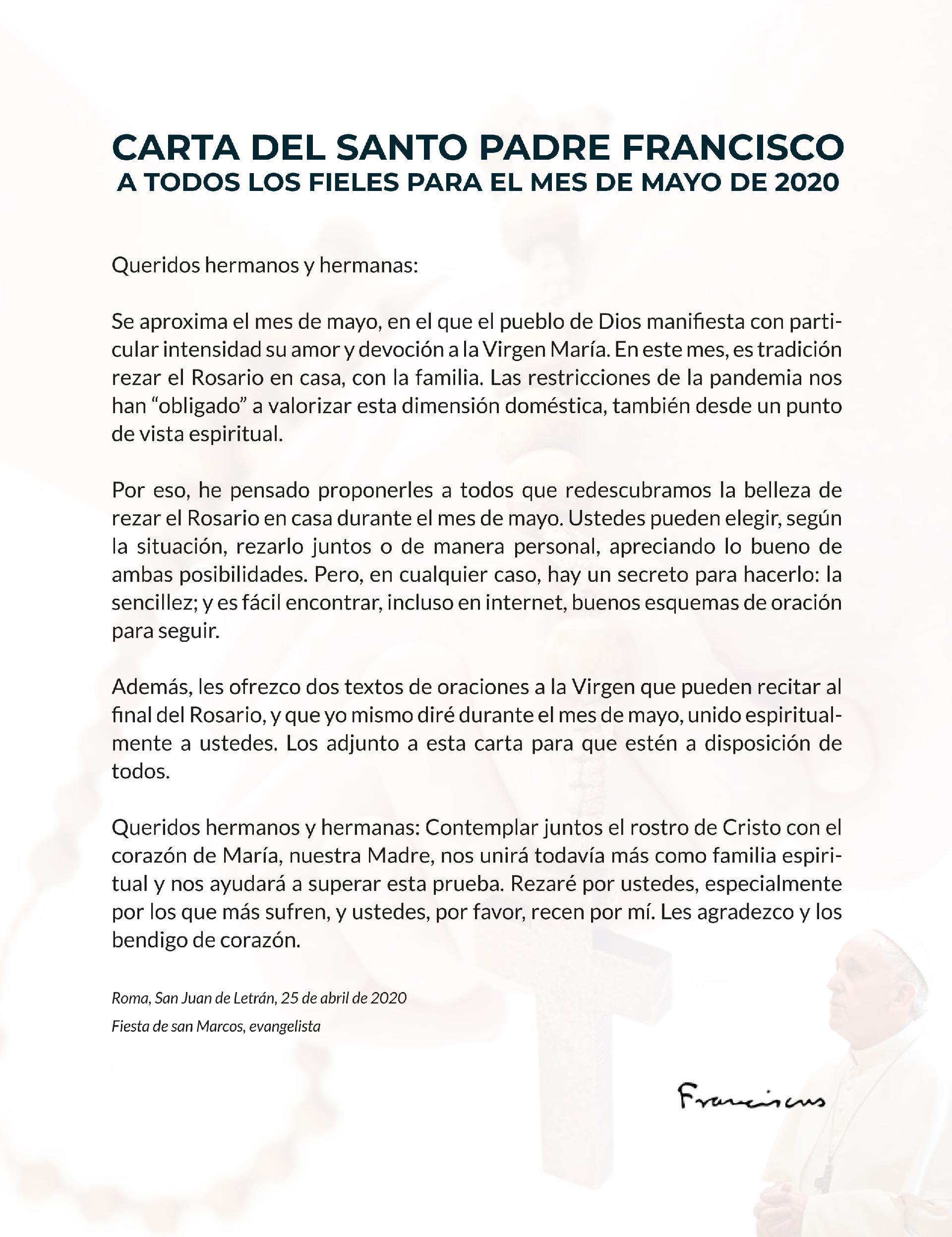 En la misiva, el Papa incluye dos oraciones a la Virgen, que sugiere recitar al final del Rosario, con las que los fieles también se unirán espiritualmente con él, quien las rezará durante el mes mariano.