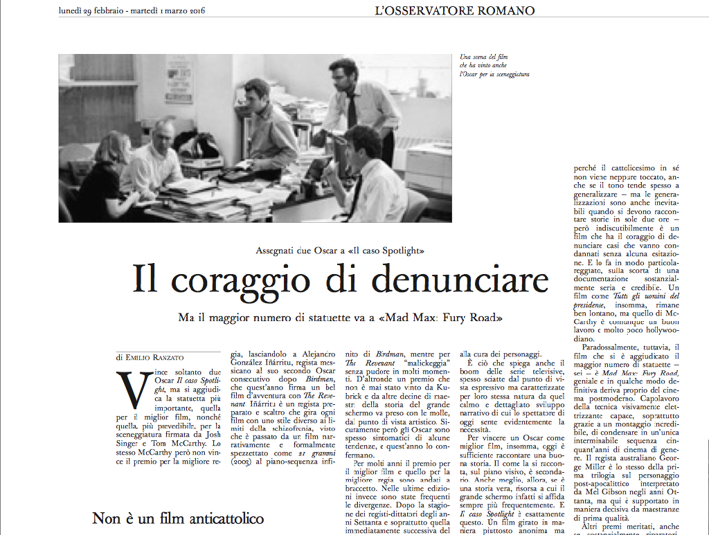 Spotlight recibe el Oscar y L'Osservatore Romano lo califica como "un filme emocionante, y no es anticatólico"