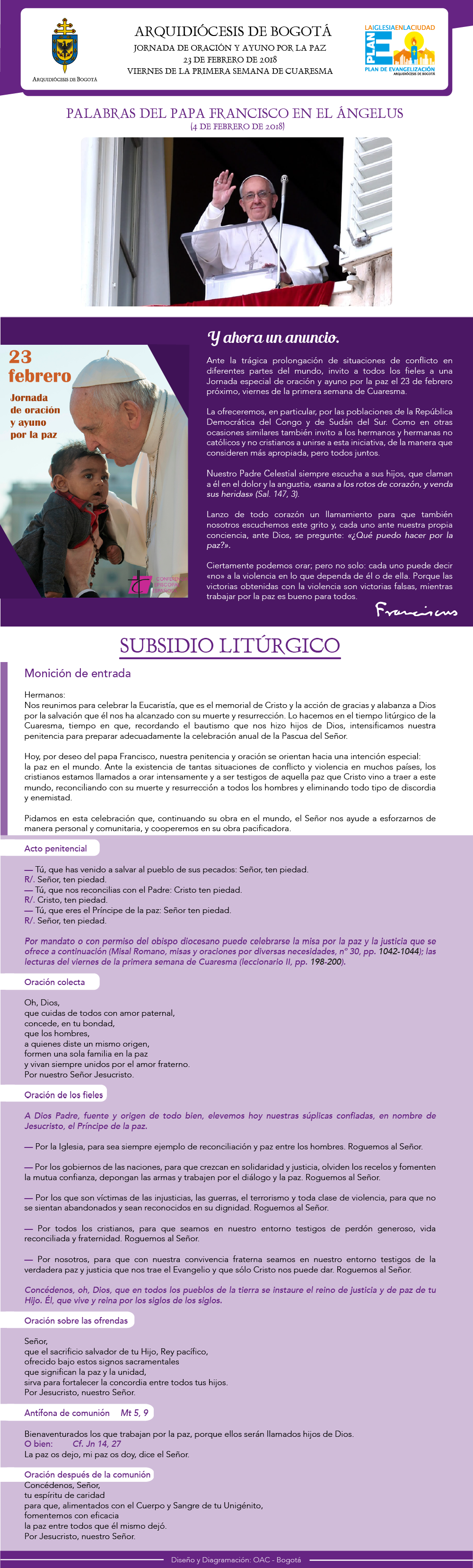 “Ante la trágica prolongación de situaciones de conflicto en diferentes partes del mundo, invito a todos los fieles a una Jornada especial de oración y ayuno por la paz el 23 de febrero próximo, viernes de la primera semana de Cuaresma. La ofreceremos, en particular, por las poblaciones de la República Democrática del Congo y de Sudán del Sur. Como en otras ocasiones similares también invito a los hermanos y hermanas no católicos y no cristianos a unirse a esta iniciativa, de la manera que consideren más apropiada, pero todos juntos.